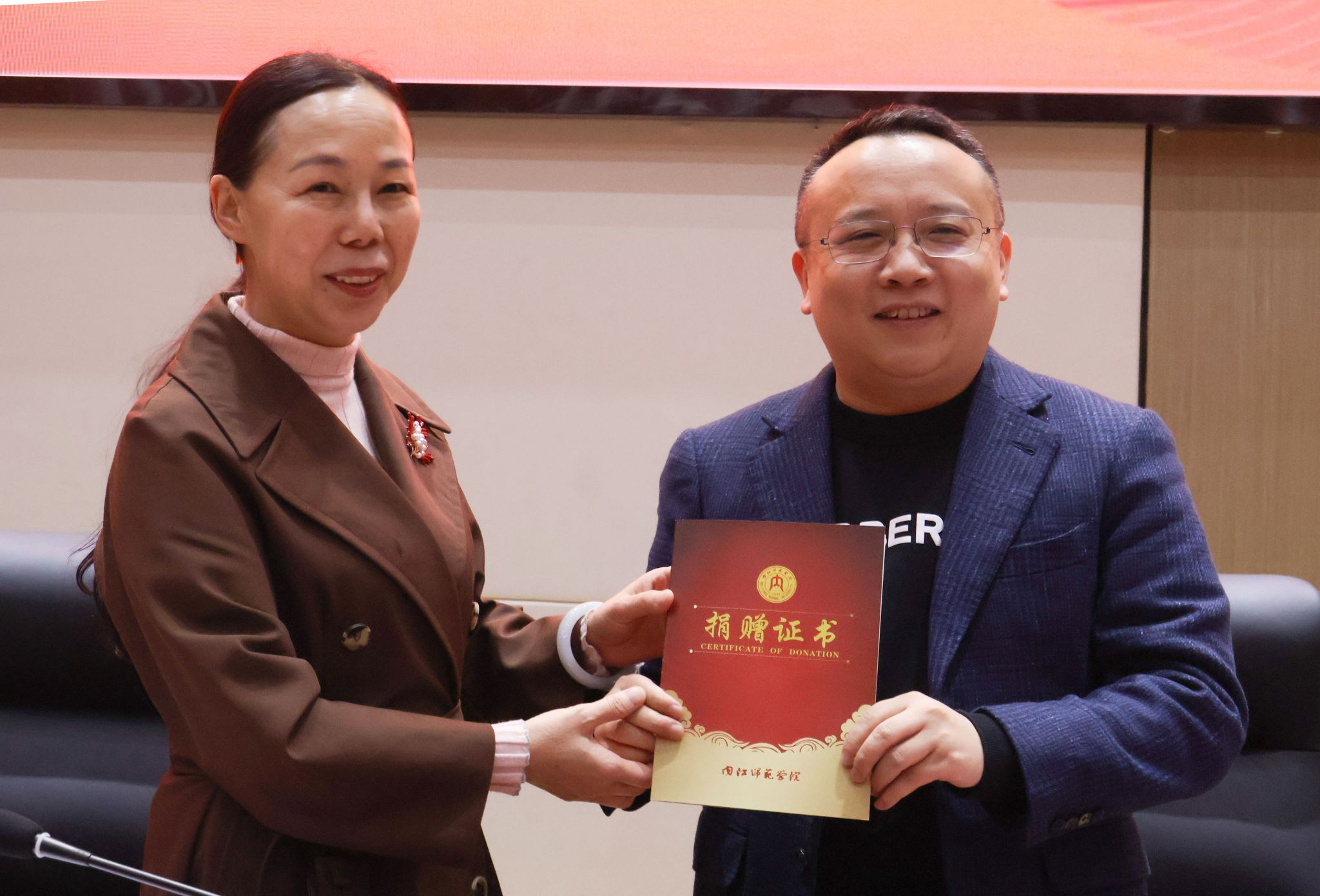 李益彬代表公司向雷志平颁发了捐赠证书,并在致辞中对雷志平长期以来对公司员工工作的大力支持表示衷心感谢,对雷志平在校名石、捐资设立教育基金和奖助学金等感恩母校的行为表示由衷敬意和诚挚感谢。