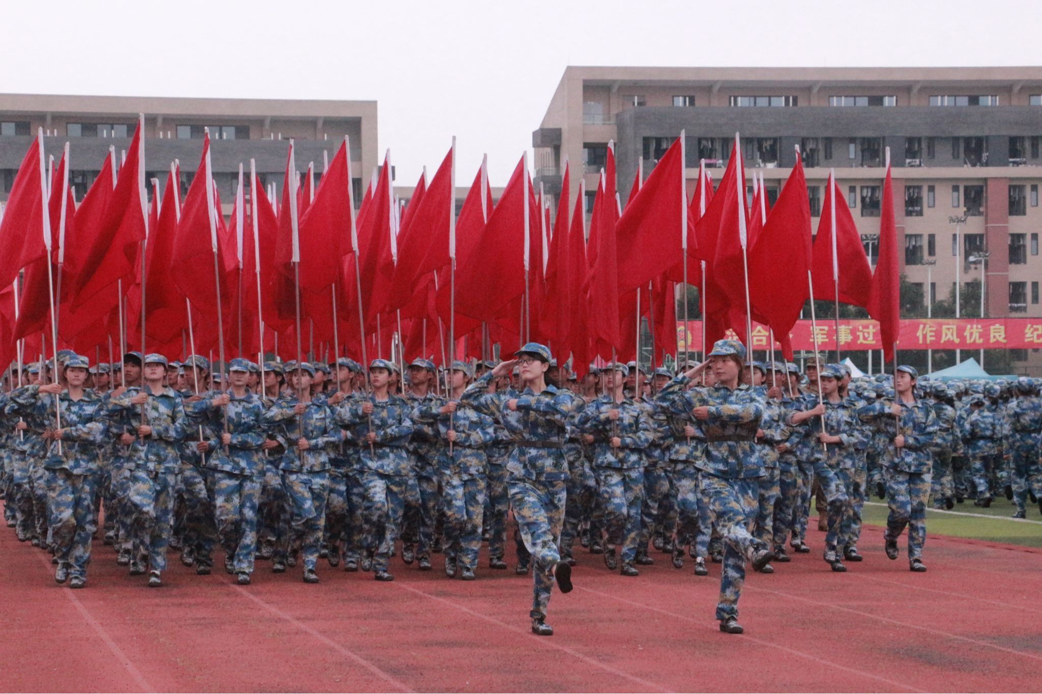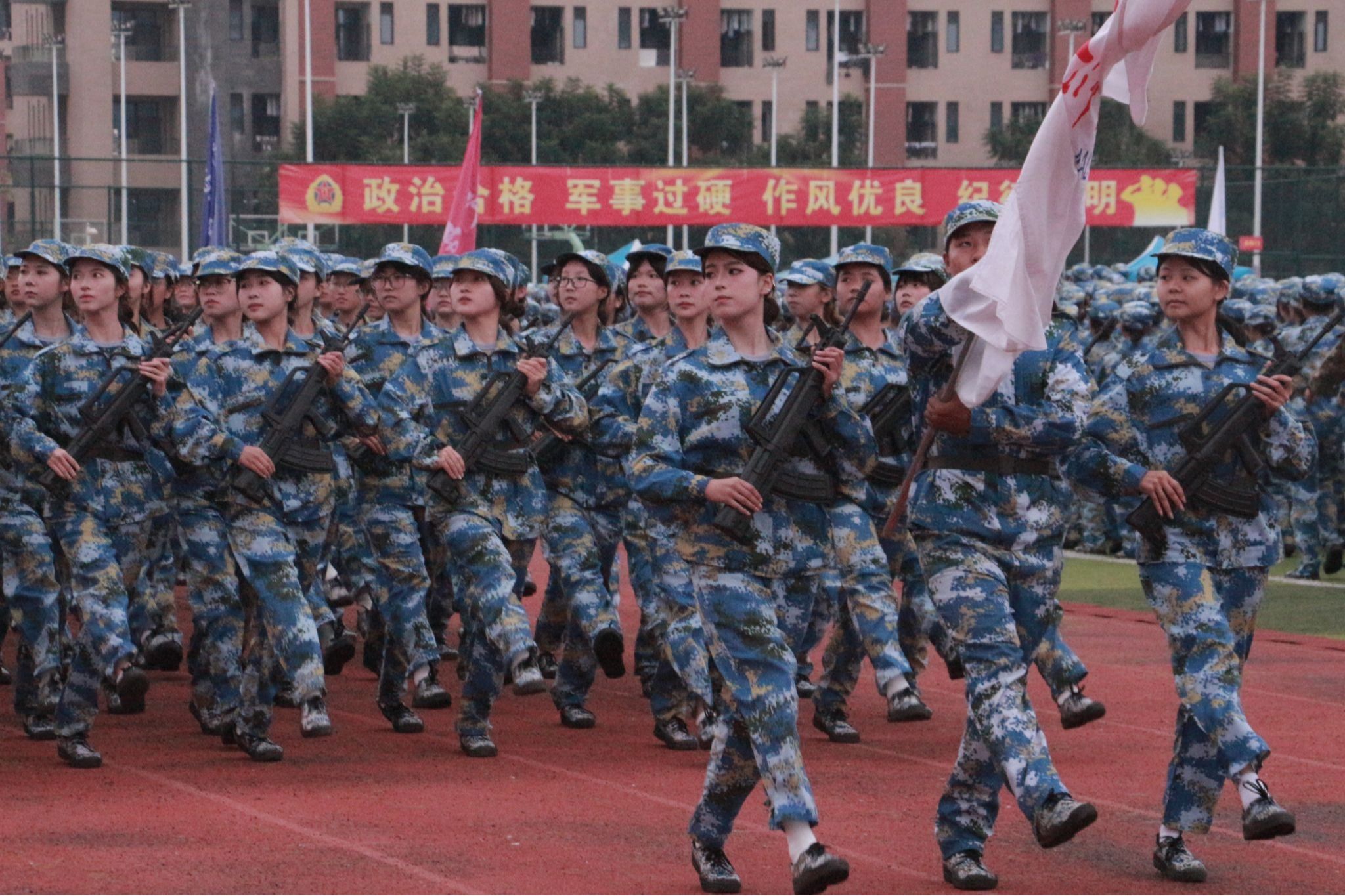 庄严肃穆的升旗仪式后,汇报表演正式开始。由多个公司组成的红旗方队和持枪方队率先登场,他们身姿挺拔、口号嘹亮、斗志昂扬。随后,由公司2025级新生组成的一营一连至一营四连分列式方队依次走过主席台接受检阅。各连队步幅步速一致、摆臂高度统一,嘹亮的口号与整齐的脚步声交织,尽显经管学子奋发向上的精神风貌。