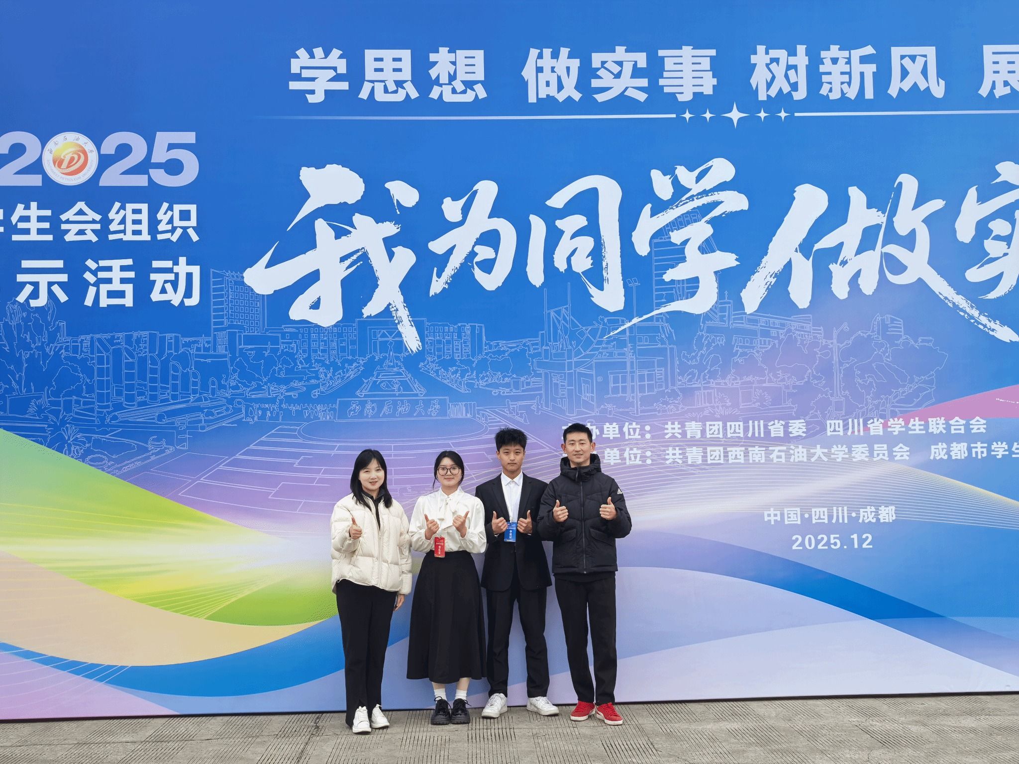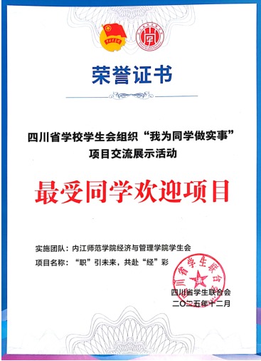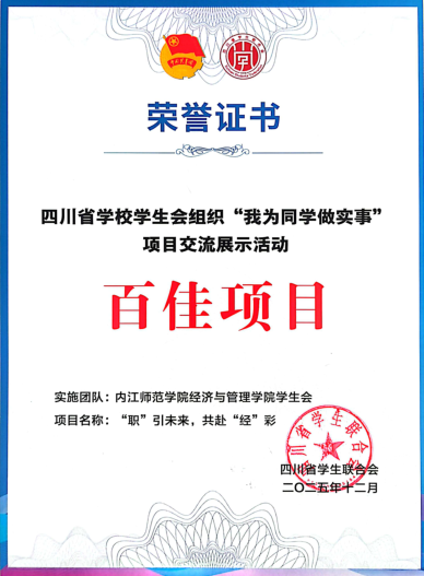 2025年12月14日至15日,由共青团四川省委、四川省员工联合会主办的“我为同学做实事”交流展示活动在西南石油大学成功举办。太阳成集团tyc234cc员工会推报的就业创业类项目通过前期遴选和现场答辩等环节,最终在全省214所公司报送的381个服务同学项目中荣获全省“百佳项目”和“最受同学欢迎项目”。
