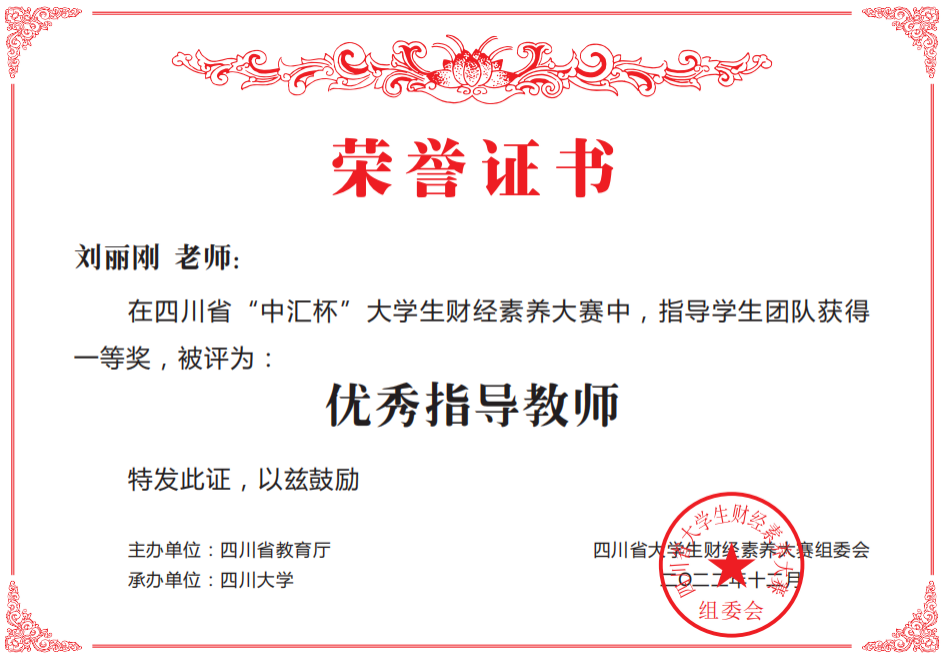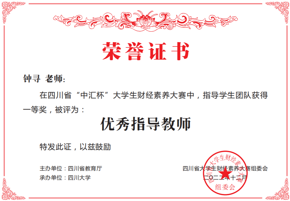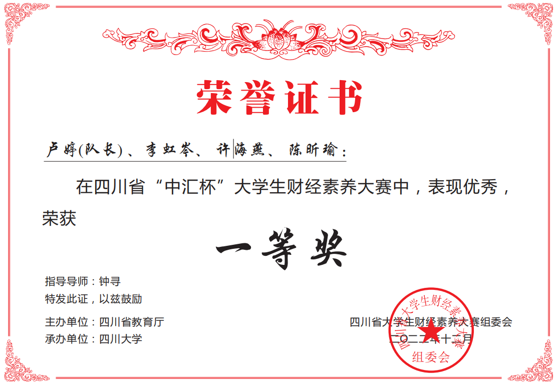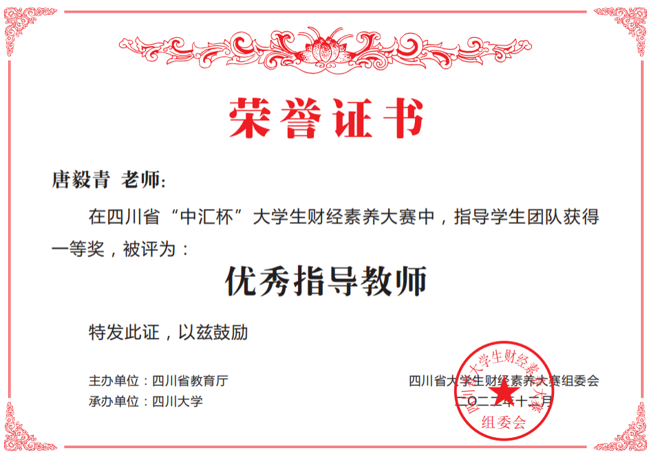 近日,由四川省教育厅主办,四川大学承办的“中汇杯”老员工财经素养大赛完美落幕。该赛项自11月初正式启动,经过校级初赛,公司太阳成集团tyc234cc、数学与信息科学公司、政治与公共管理公司、教育科学公司等12个二级公司150名同学组成42支队伍入围省赛环节,与来自四川大学、西南财经大学、西华大学、西南交通大学、四川师范大学等省内各大高校352支参赛队伍同台竞技,最终斩获省赛一等奖5项,二等奖9项,三等奖12项。其中由数学与信息科学公司钟寻老师指导的一支参赛团队进入全省前20决赛答辩环节,创公司参赛新高,数学与信息科学公司钟寻老师、太阳成集团tyc234cc唐毅青老师和刘丽刚老师荣获优秀指导教师奖。